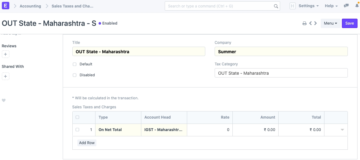 Finally, configure a set of two Sales Taxes and Charges Templates, and two Purchase Taxes and Charges Templates, for each Tax Categories created.