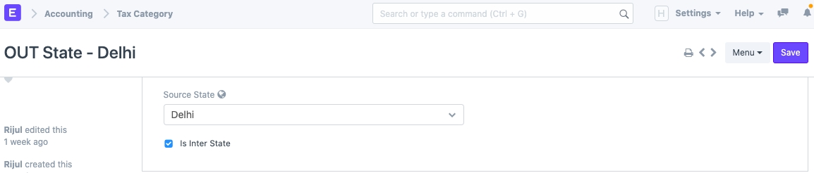 For ‘Out State’ Tax Categories, mark ‘Is Inter State’ checkbox as enabled.