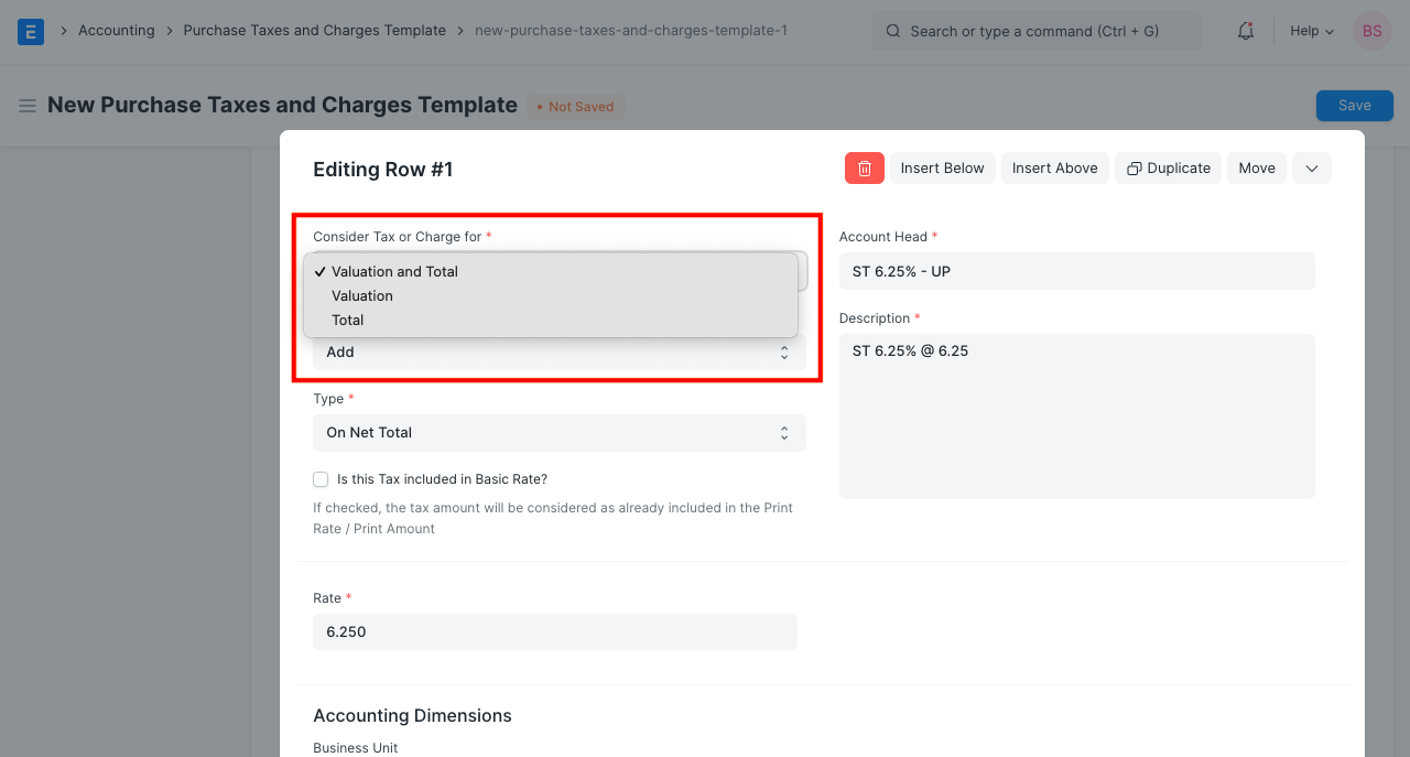 Tax or Charge categorized as for Total and Valuation will be added in the valuation of item, as well as in the totals of purchase transactions.