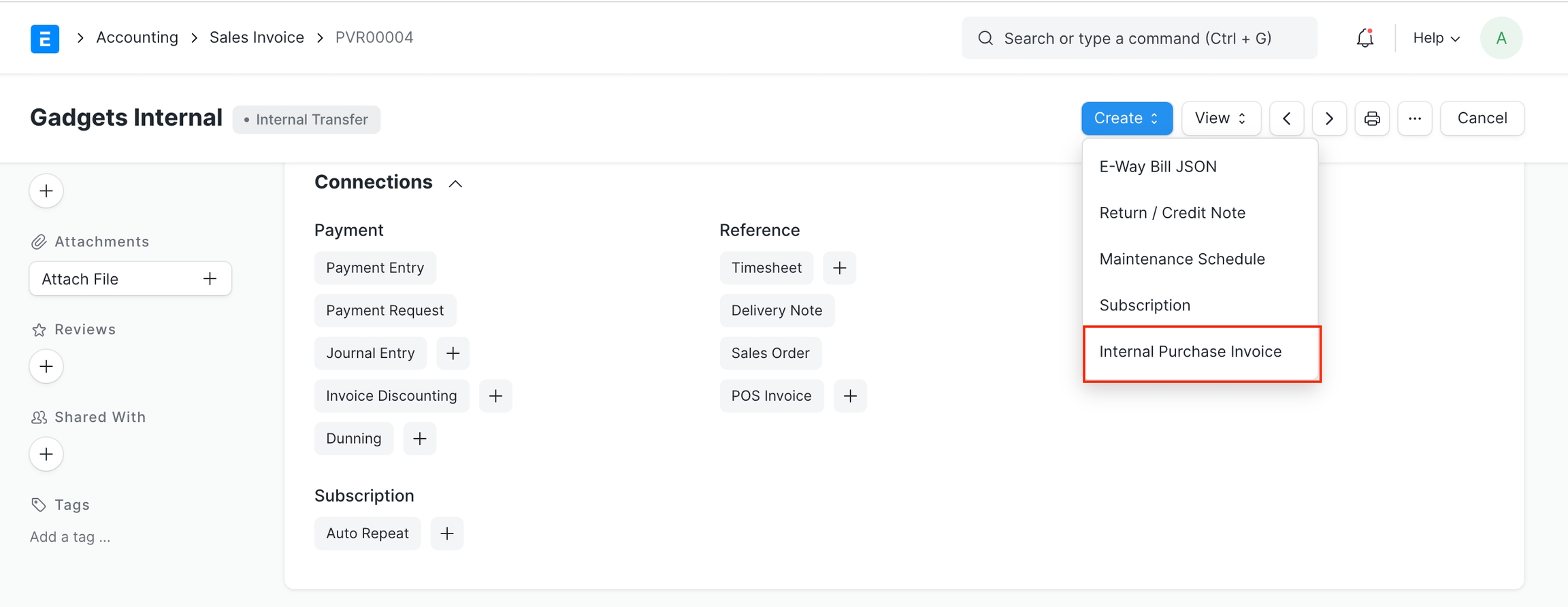 Note: Application of GST automatically on invoices is subjective to your GST configuration. Make sure you have proper tax templates configurated and appropriate addresses and GST details linked to the internal parties