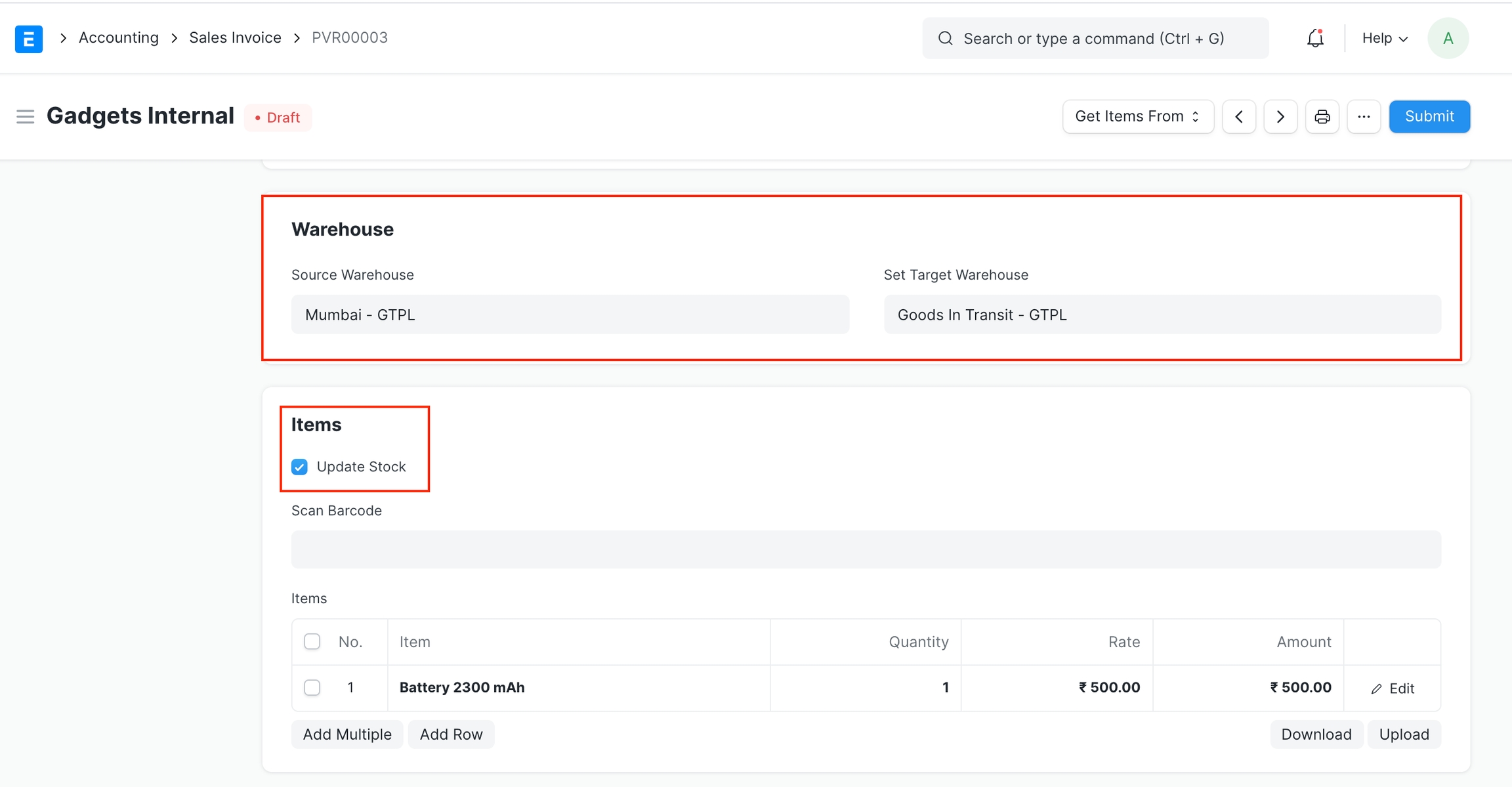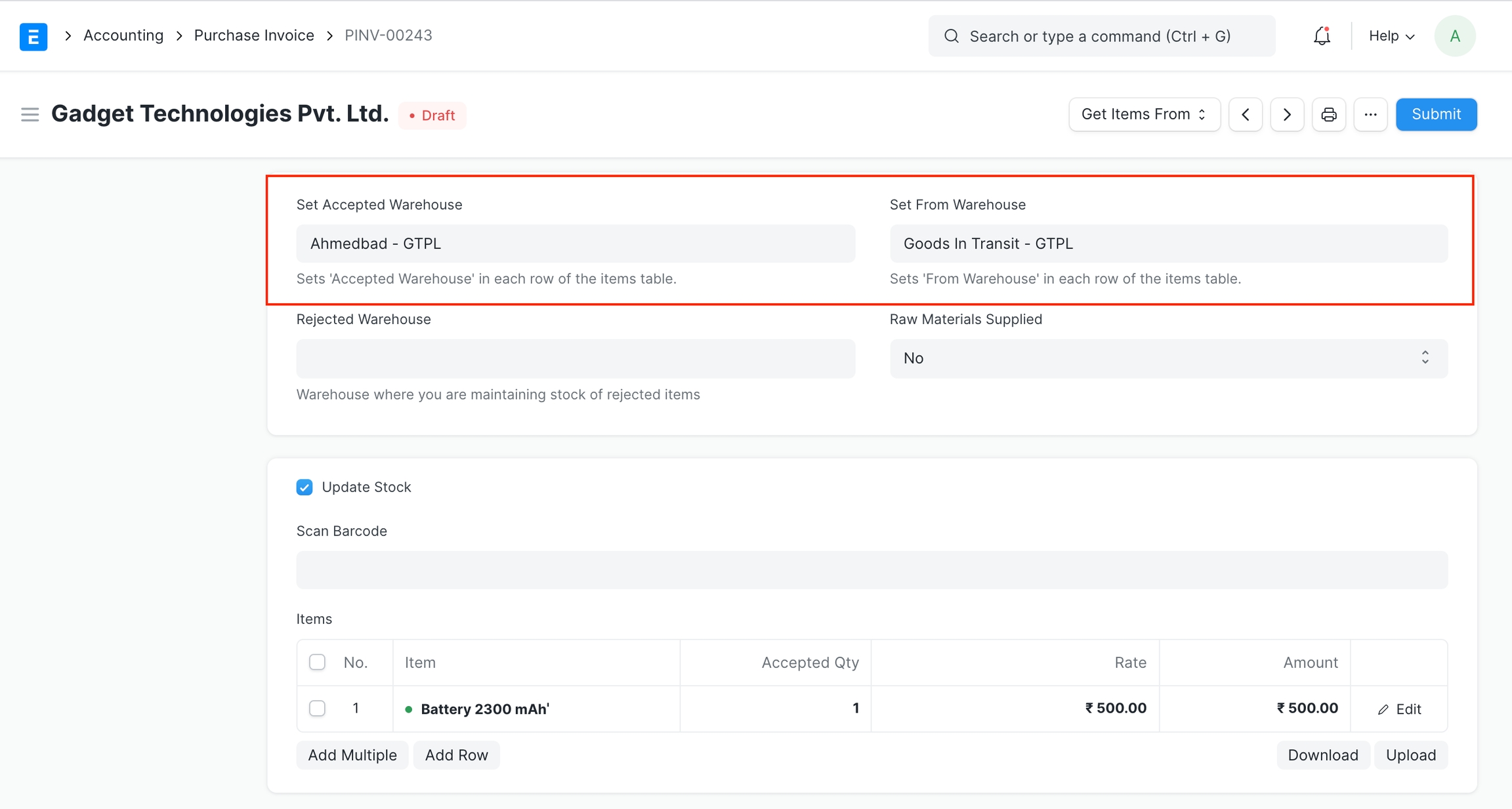 Select the Accepted Warehouse (warehouse at which stock has been received) and save and submit
