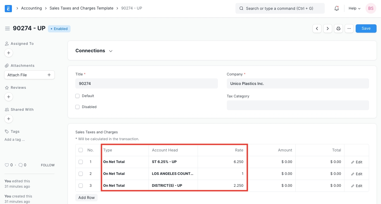 > Note: It is advised to not use the Sales/Purchase Template selected here in Item Tax Template, it may cause interference. If you want to use same tax rates for Tax Rule and Item Tax Template, use a different name for the Sales/Purchase Tax Templates.