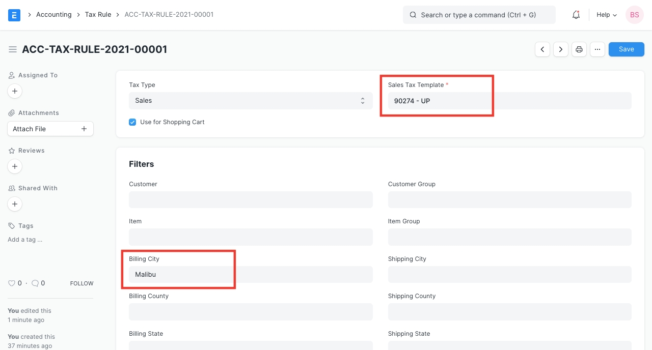 Let us configure Tax Rule so that system automatically applies specific tax rates when a specific condition matches. For example, if the city in the billing address of customer is 'Malibu' then a 6.25% of state tax, 1% of county tax and 2.25% of district tax should be applied.