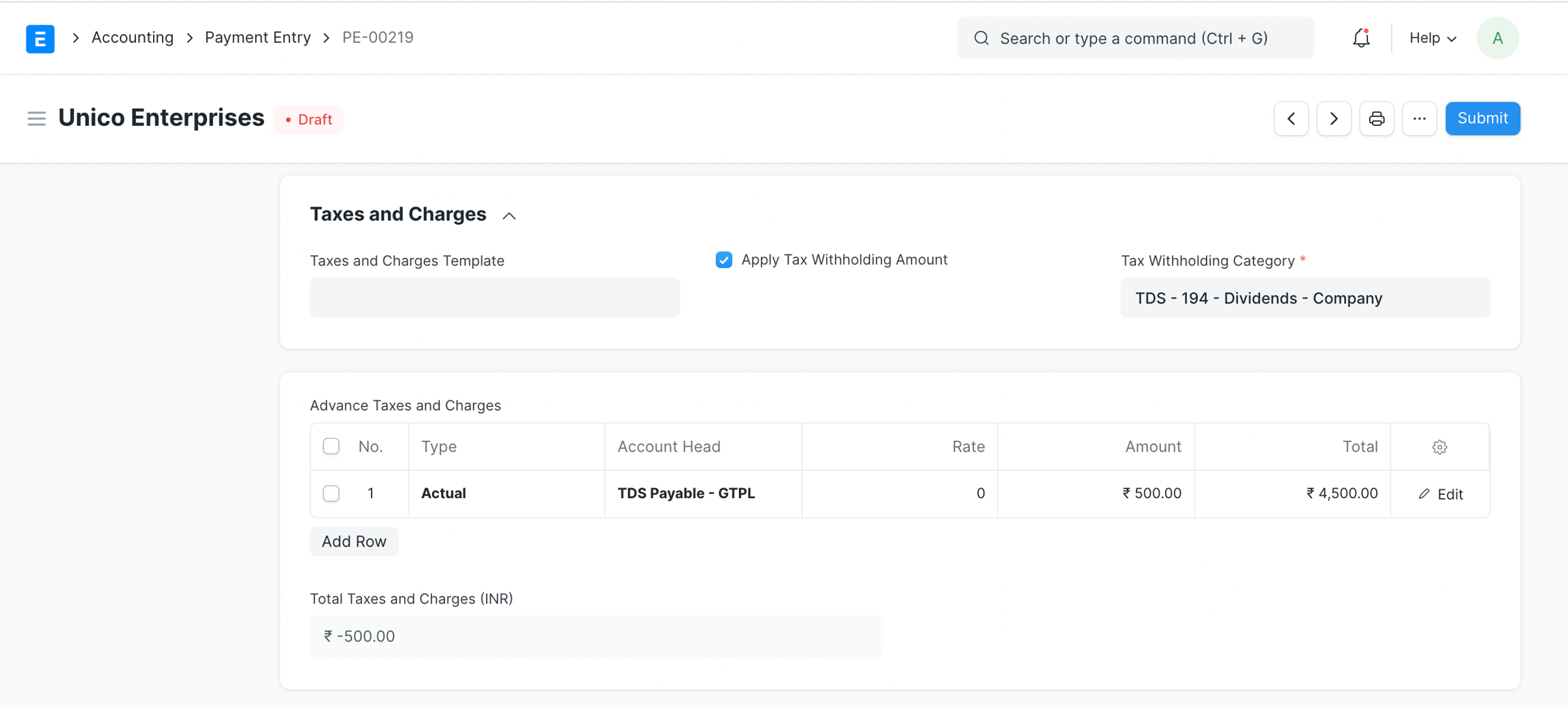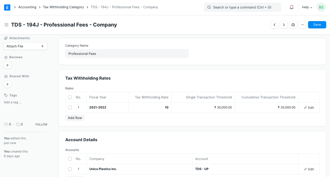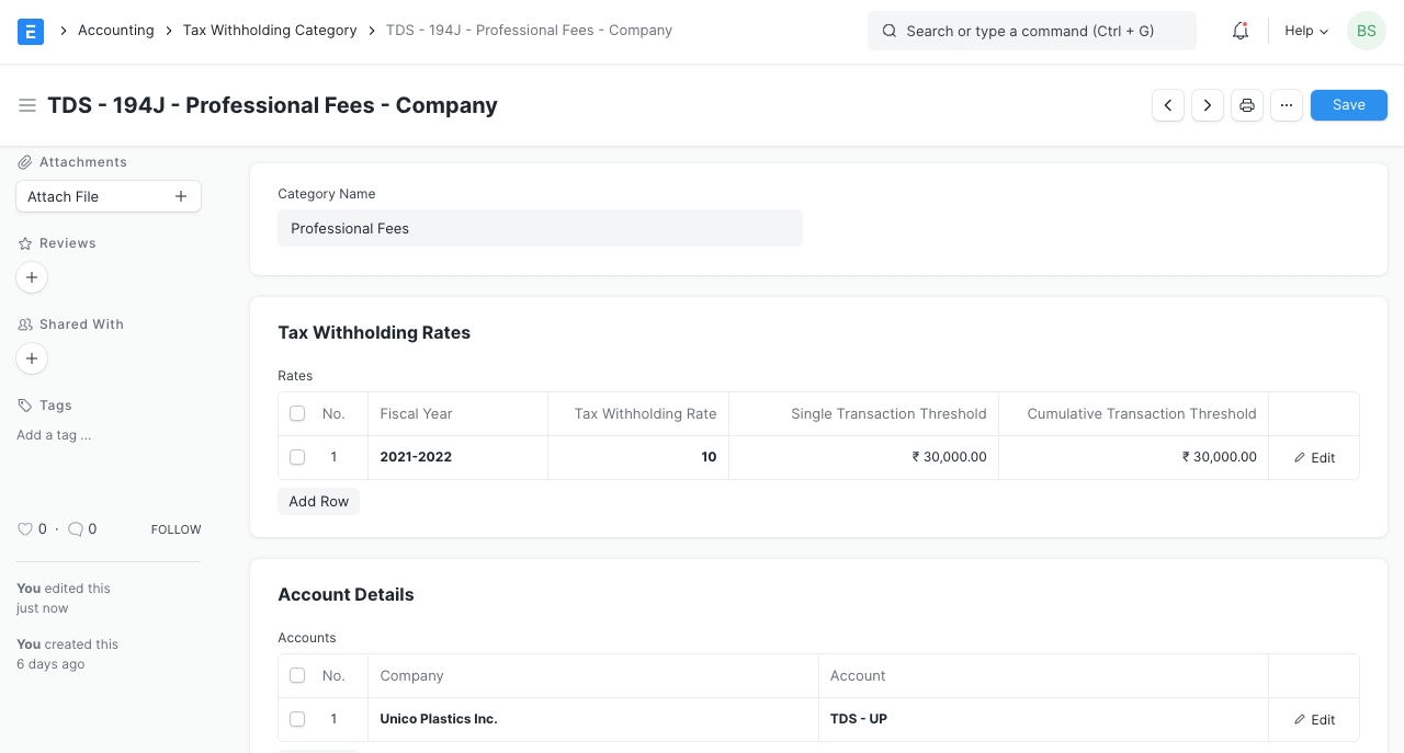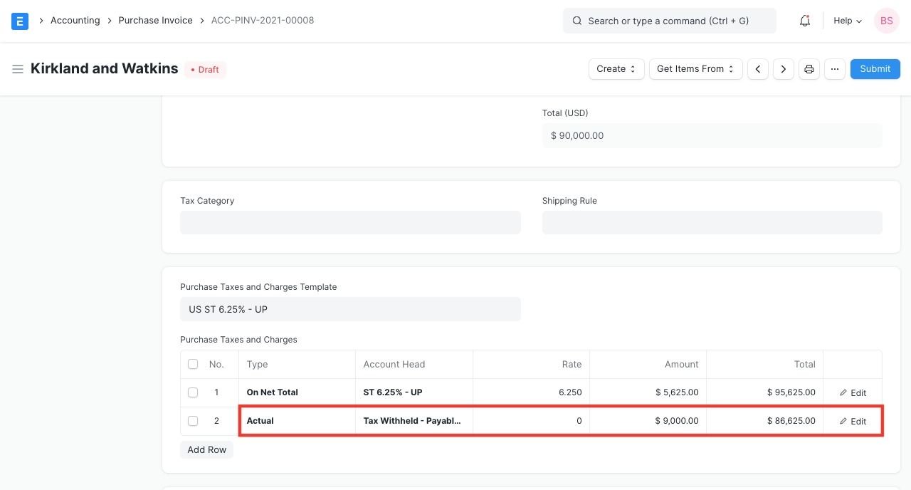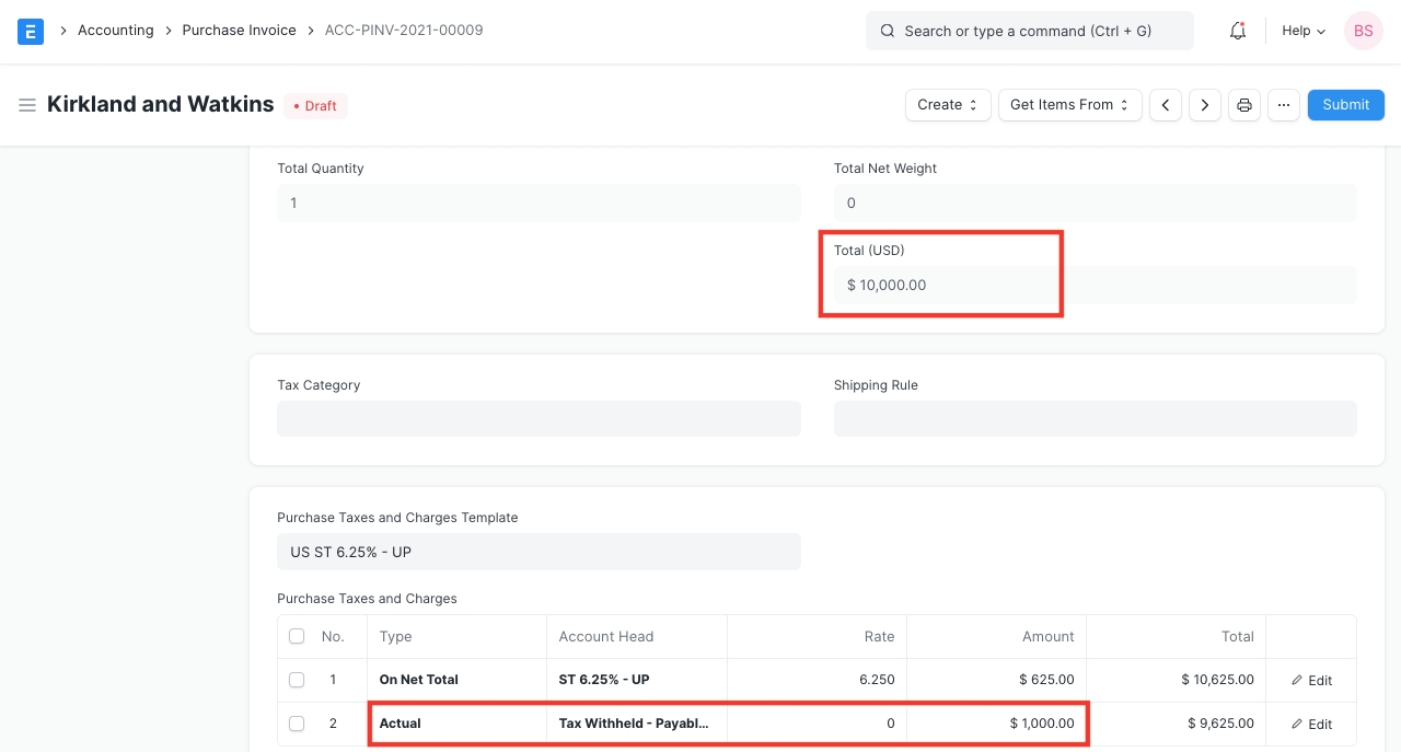 Tax Withholding Category in Purchase Invoice To see the effect of Cumulative threshold, let's create an invoice with of amount 10,000 and submit it.