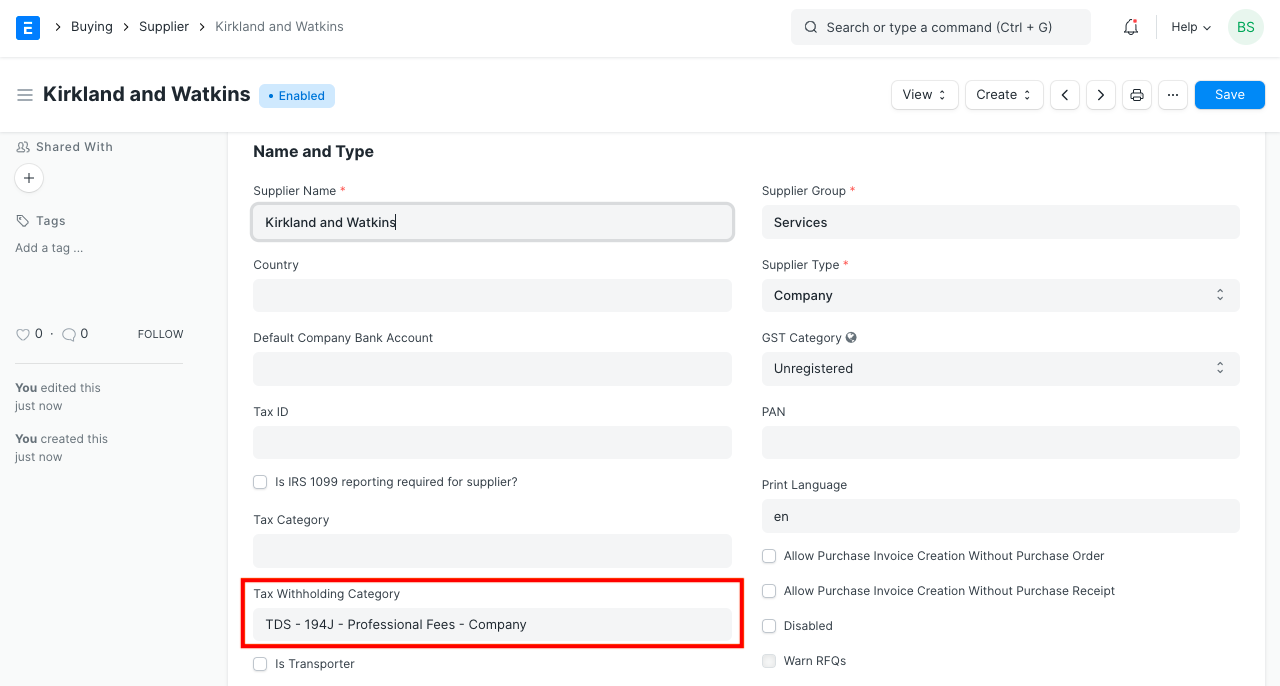 Tax Withholding Category is Tax Deducted at Source.