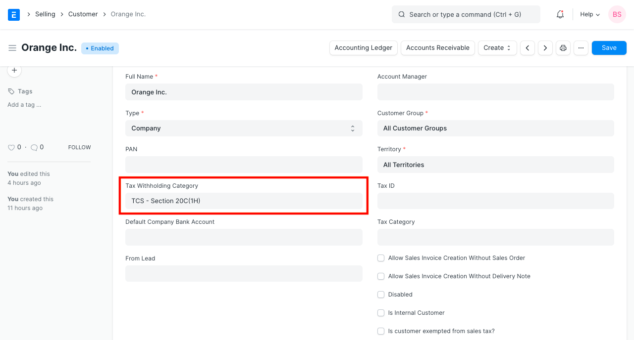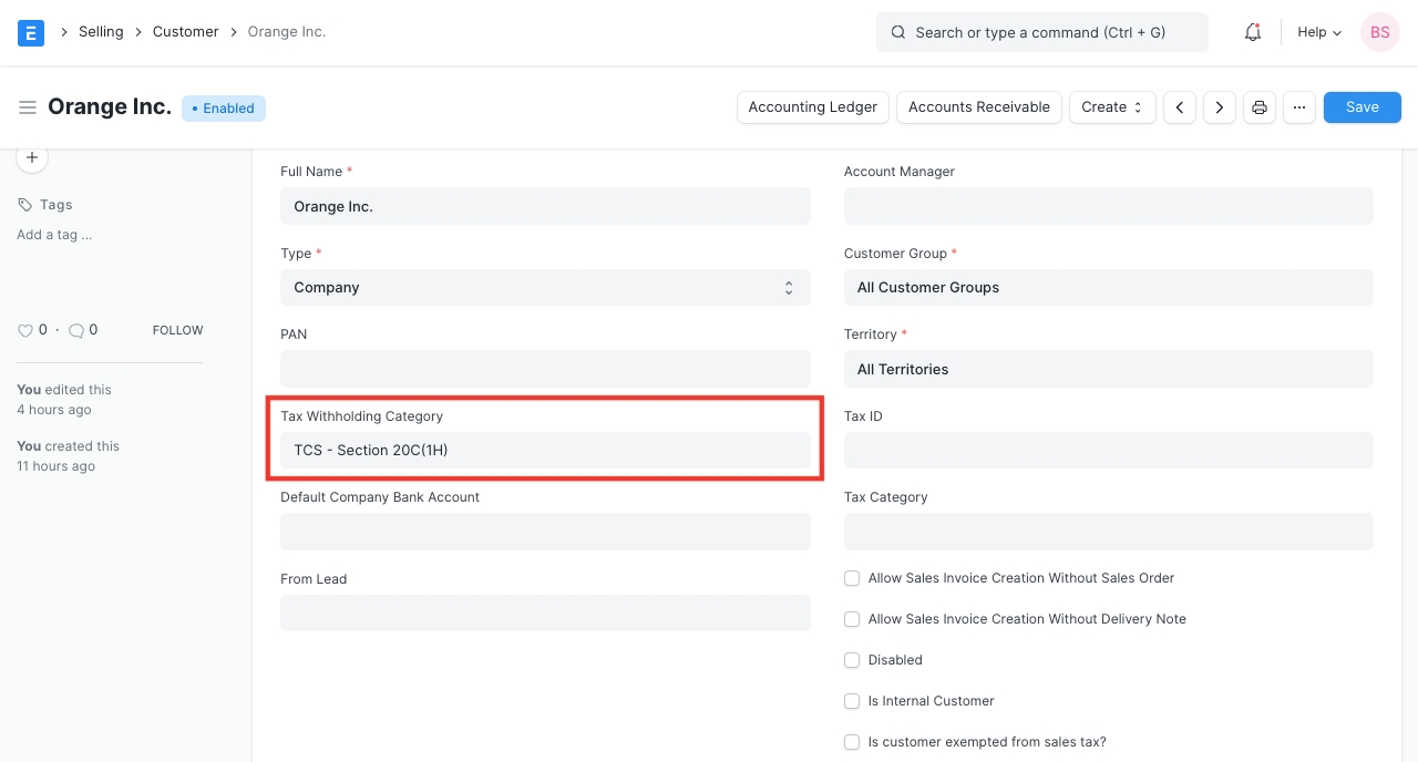 In the following example, we have create a Tax Withholding Category for TCS - Section 20C(1H) and set it up against an eligble customer.