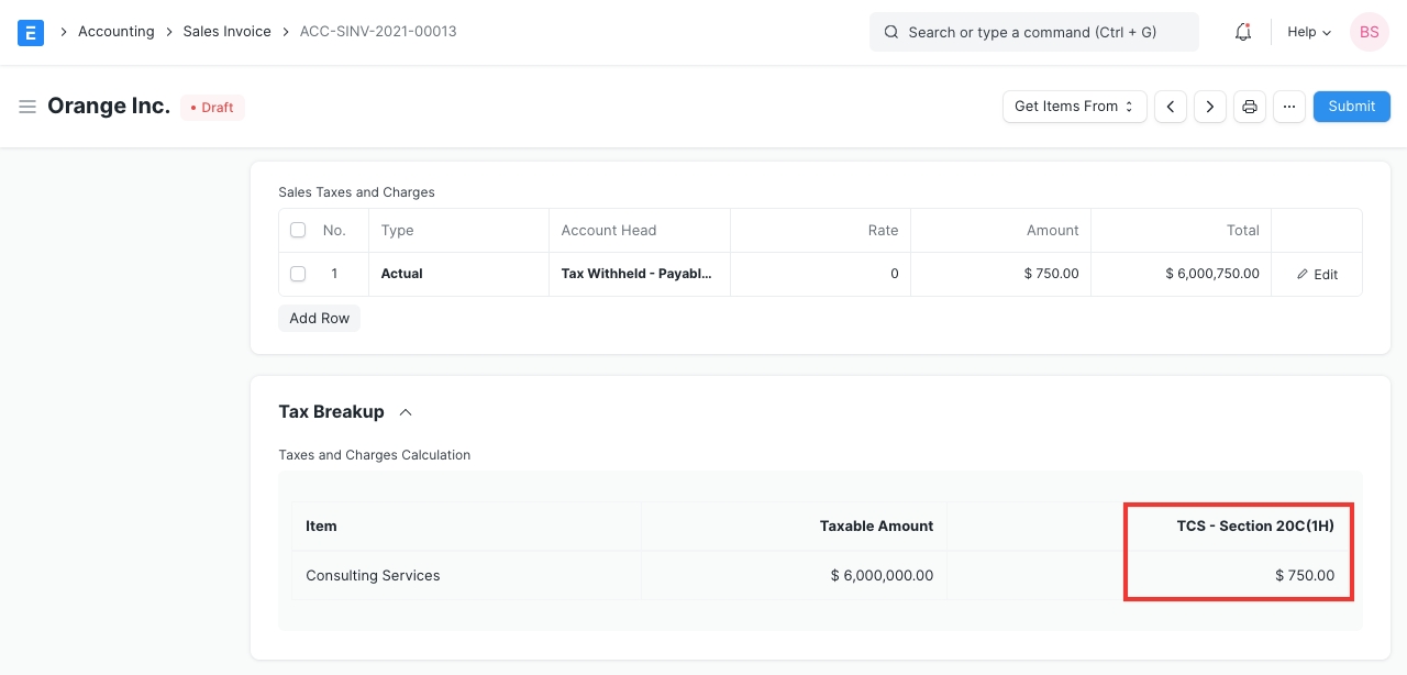 TCS Calculation in Sales Invoice Since the invoice cross the Cumulative threshold (50 Lakhs), we see that tax has been charged. Hence, tax based on the rate provided in the Tax Withholding Category is applied accordingly. Note that, as per the scheme, the TCS is calculated on the amount exceeding the threshold i.e 0.075 % of 10 Lakhs.