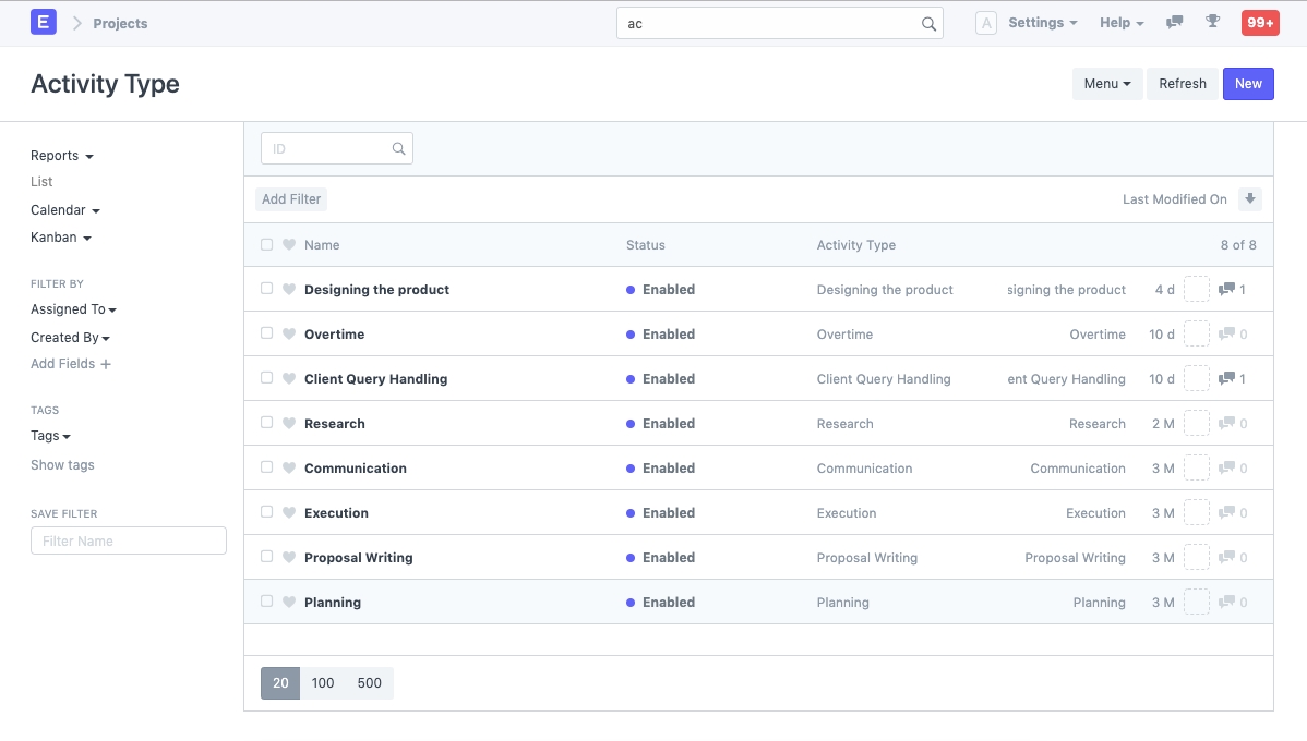 Activity Type is a list of different types of activities against which a Timesheet can be made.