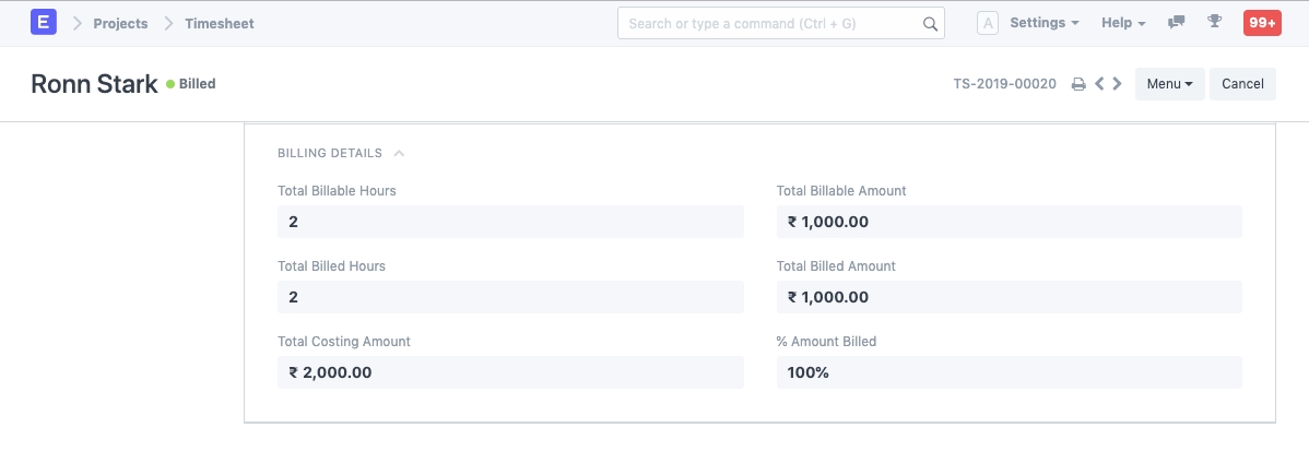 % Amount Billed: Once the Timesheet is submitted, and a Sales Invoice is created from the Timesheet, the percentage of the Amount out of the Total Billable Amount which has been amounted for the Total Billed Amount gets calculated and is reflected here.