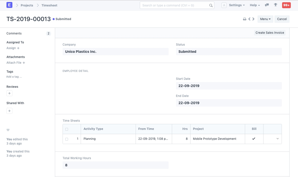Total Billed Hours: Once the Timesheet has been submitted, you will get an option to create a Sales Invoice from the Timesheet. The number of hours for which the Customer shall be billed will be fetched over here, and once the Sales Invoice is submitted, the Total Billed Hours will be fetched.