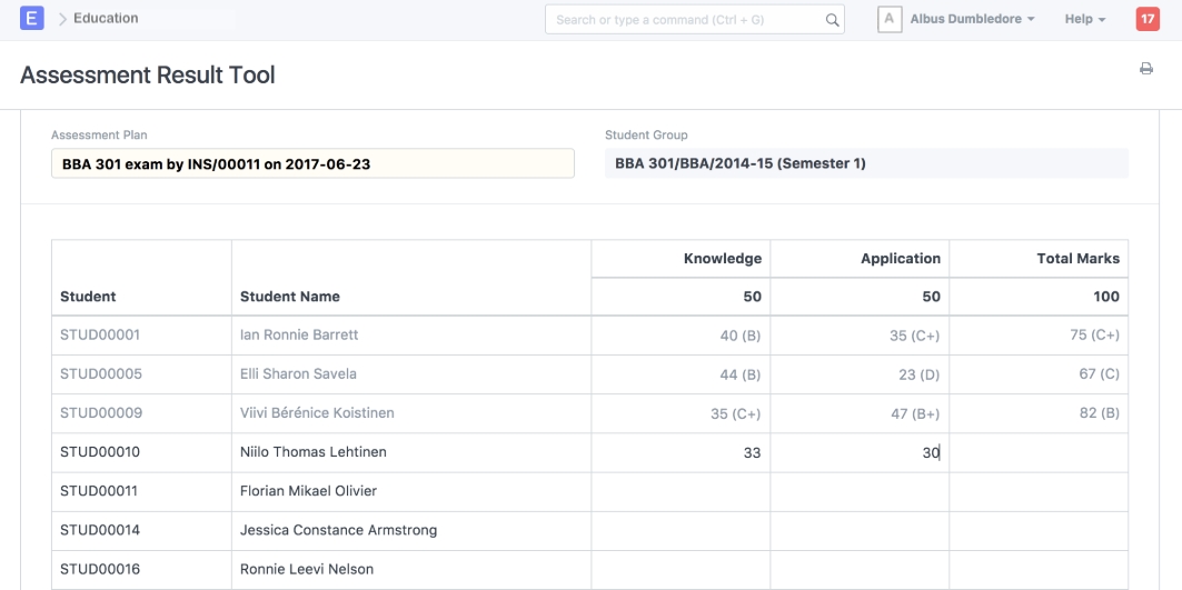 Assessment Result Tool helps you entering marks earned by the Students for a specific course. In this tool, based on the Assessment Plan, all the Student will be fetched into the Assessment Result Too