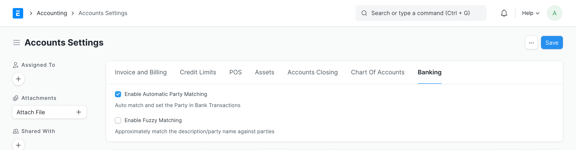 You can optionally enable automatic party matching so that a party is auto set (if matched) in the Bank Transaction. To enable this, go to: