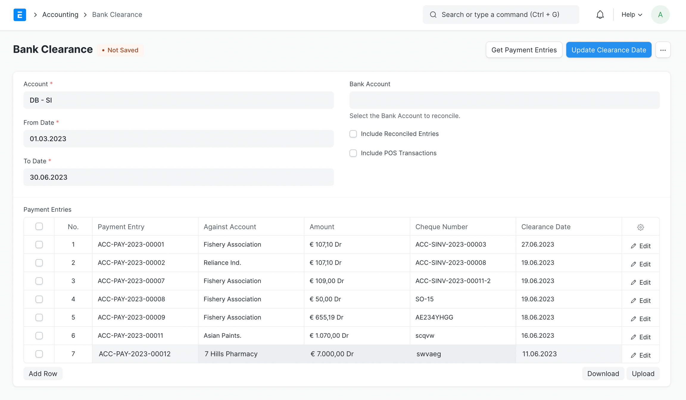 In each of the entries, on the rightmost column, update the Clearance Date field and click on the Update Clearance Date button. By doing this you will be able to sync your bank statements and entries into the system.