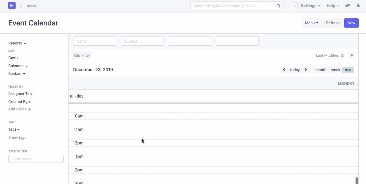 Alternatively, you can also create an event from the 'Day View' of the Calendar. This view is broken into various slots throughout the day. You can select the slot for the start of the event, enter the subject of the event and drag it own till the event end time.