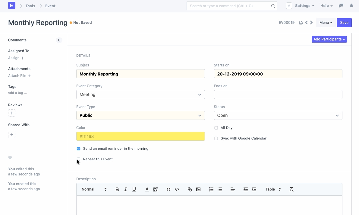 You can also enter the last day of the repeated occurrence in the 'Repeat Till' field. In case of infinite repetitions, you may choose to leave this field blank.