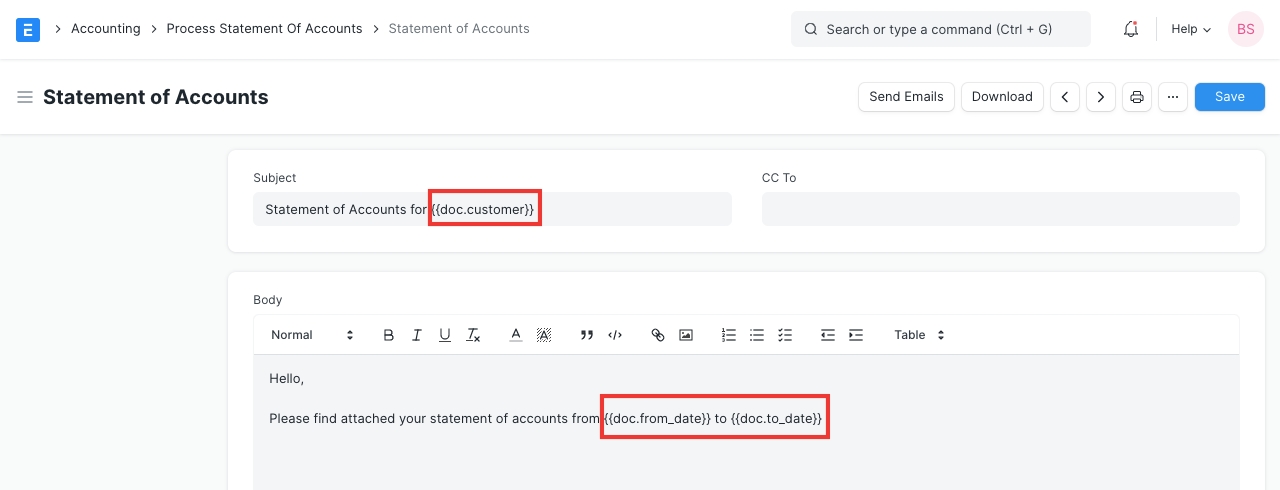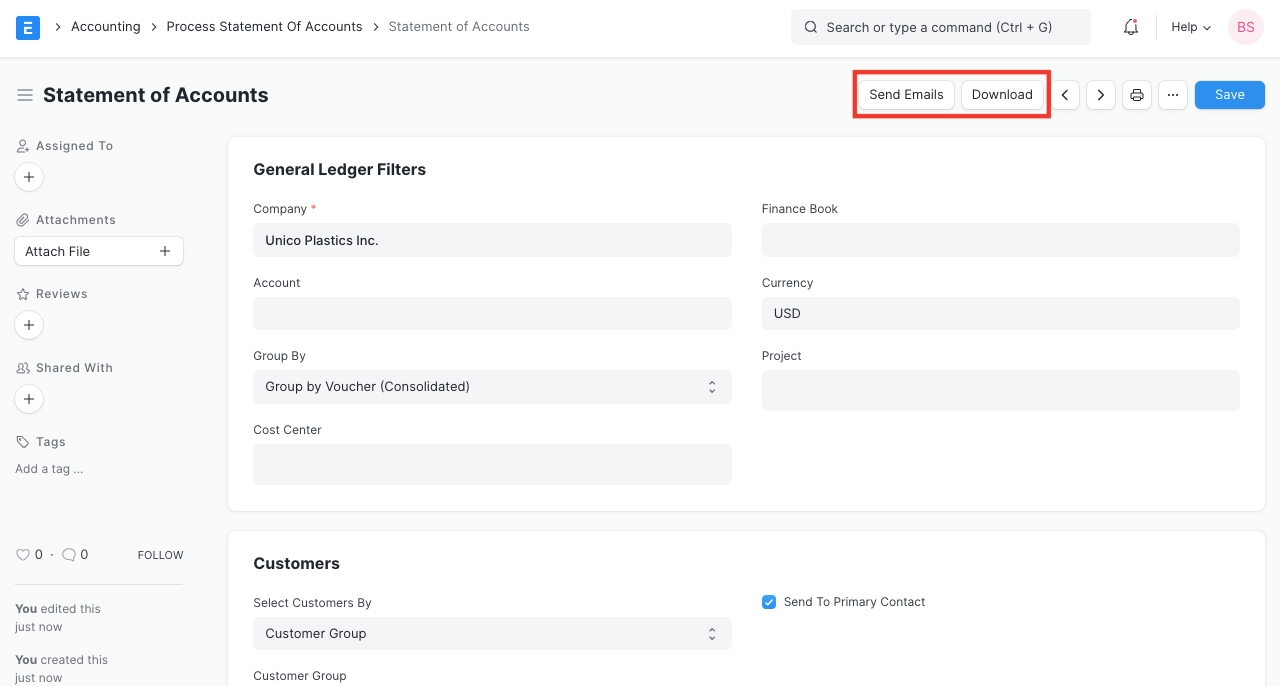 New Process Statement of Accounts In the "Customers" section, you have an option to select customers in the child table and fetch their primary and billing emails.