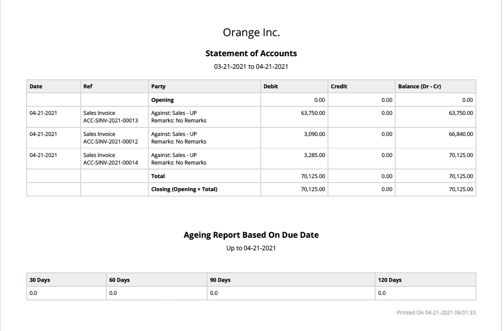 This feature is useful when you want to send email updates to customers periodically about their transactions (like Sales Invoices). In the PDF attachment sent via emails sent to the customers, for each customer, there will be details like invoice posting date, Sales Invoice number, debit and credit details, etc relevant to their account.