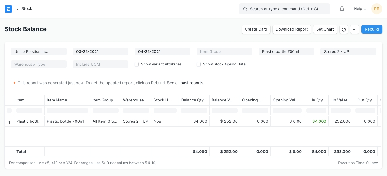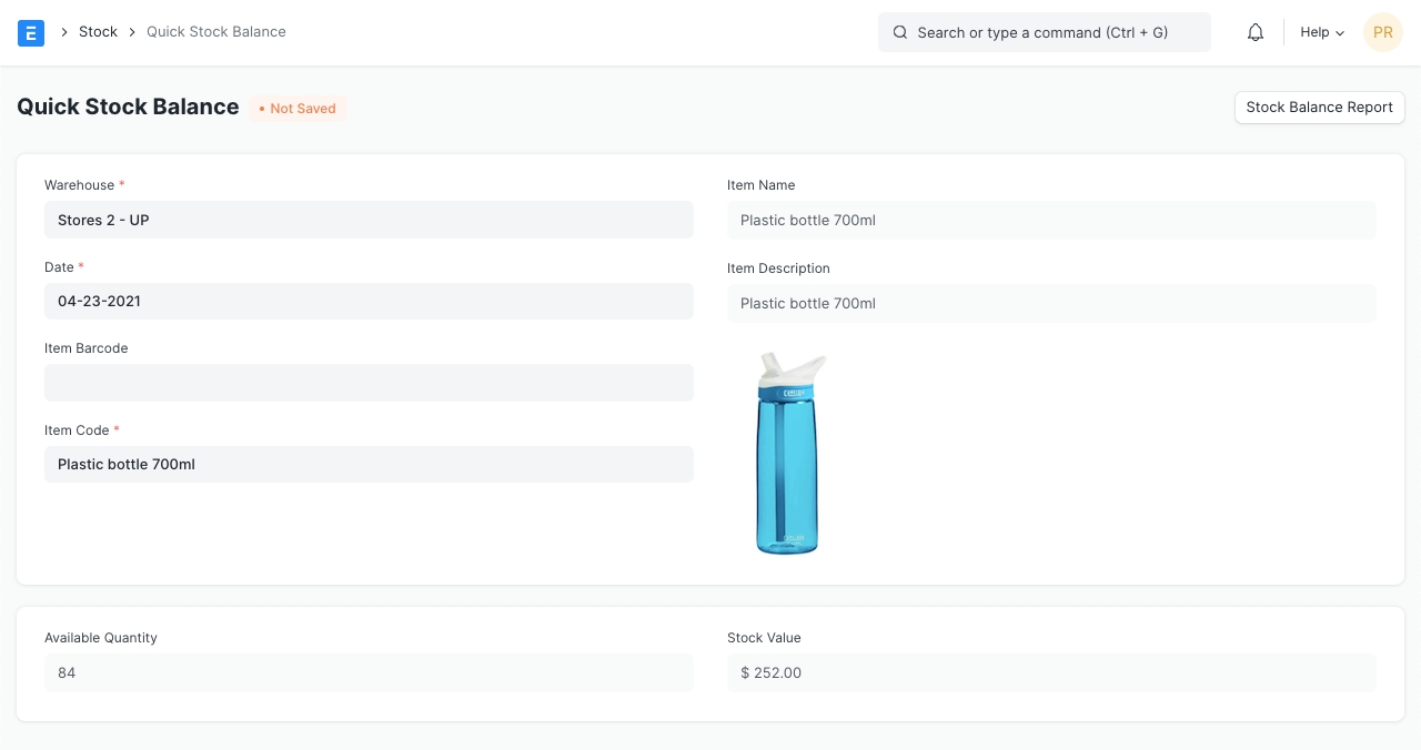 You can also view the Stock Balance report by clicking on 'Stock Balance Report' . It will redirect you to the report with the Item and Warehouse filters populated.