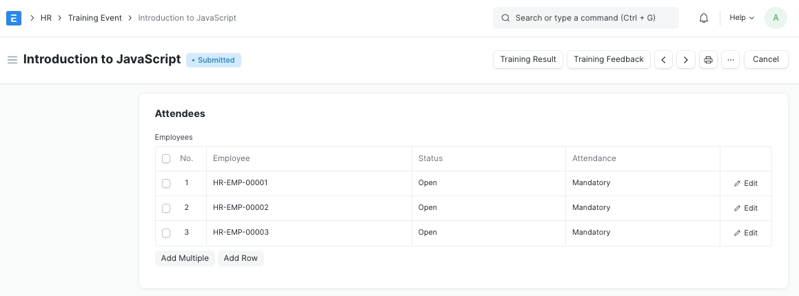 You can invite your employees to attend the Training Event. You can do so by selecting the employees to be invited in the Employees table.