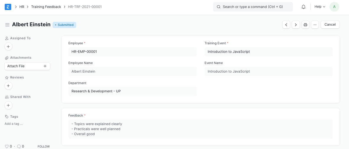 Once the Training is complete, employees can share their feedback via Training Feedback.
