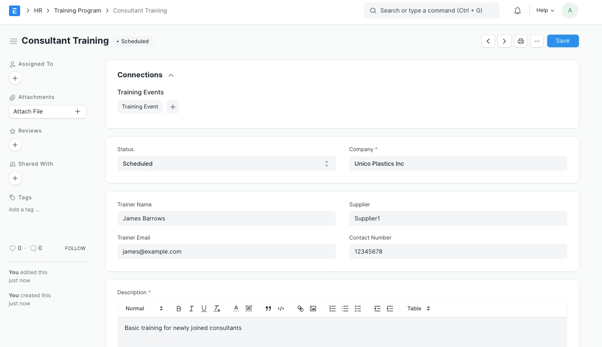 > Note: By default, the Status of the Training Program is 'Scheduled'. However, you can change the status to 'Completed' or 'Cancelled' as per the requirement.
