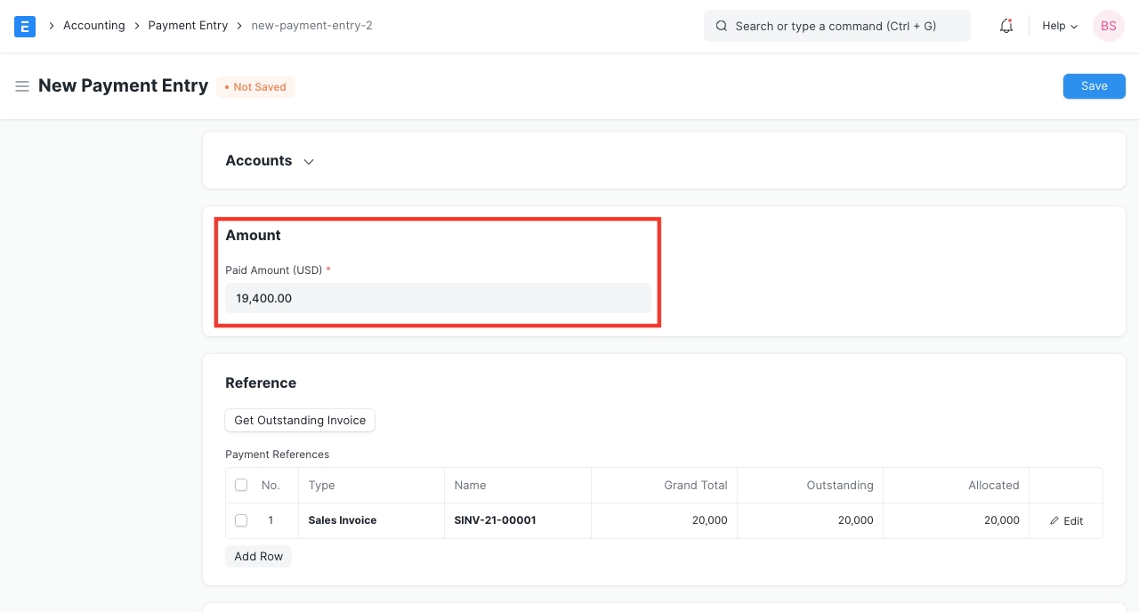 You can notice that there is a difference of 400 in the Payment Amount and the Amount Allocated against Sales Invoice. You can book this difference account under Withhold Account.