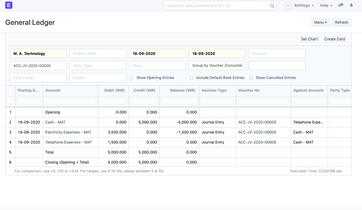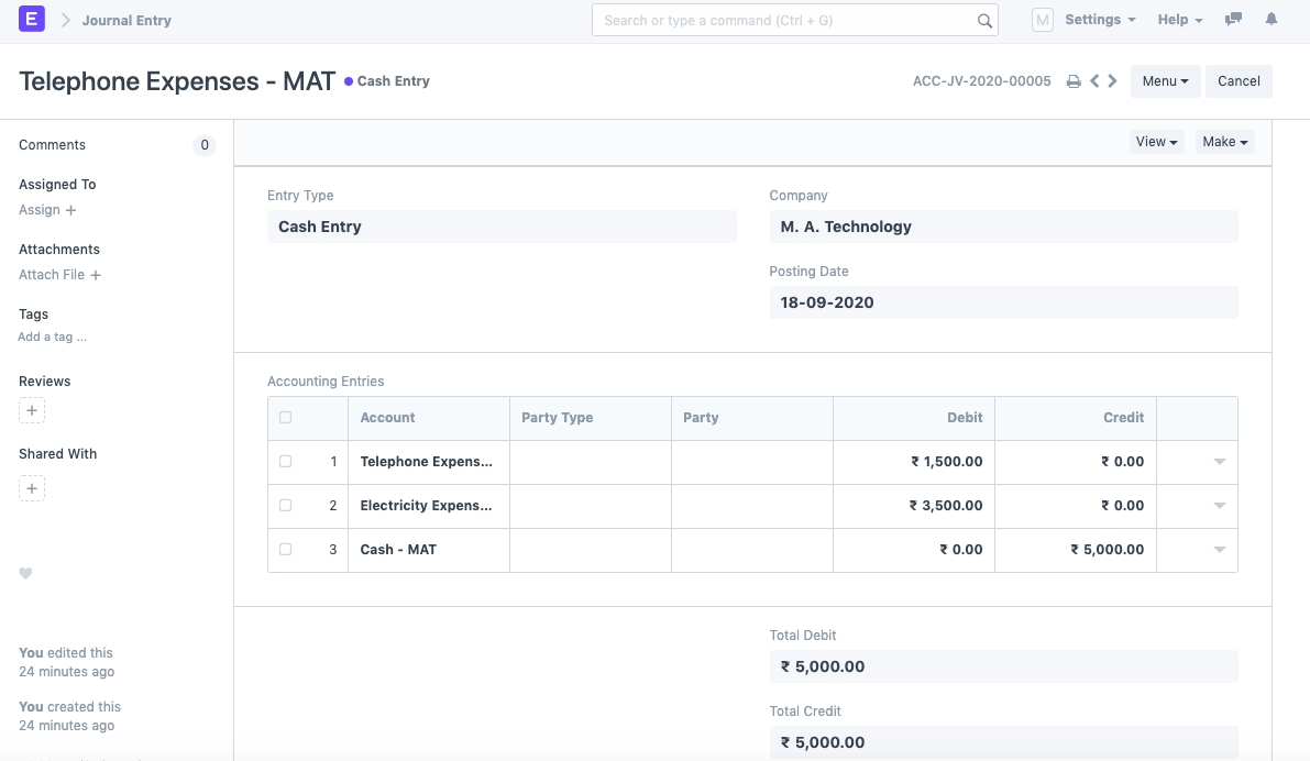 4) Add the Expense account in the table. You can also add multiple Expense accounts (eg. Telephone Expense, Travel Expense, etc.) as separate rows. Make sure the Debit and Credit side is balanced.