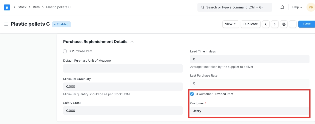 In the 'Purchase, Replenishment Details' section, check 'Is Customer Provided' and set a default Customer. Note that 'Is Purchase Item' needs to be unticked to use this feature.