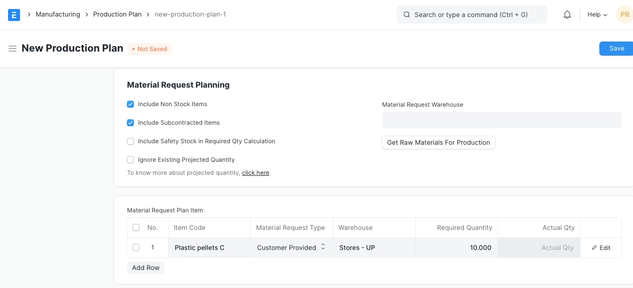 Material Request in Production Plan Once a component in a BOM is set as 'Customer Provided' and 'Material Request' is created from a 'Production Plan', it will create both 'Material Request' with type 'Purchase' and 'Customer Provided'. From there, a 'Stock Entry' with purpose 'Material Receipt' can be created.