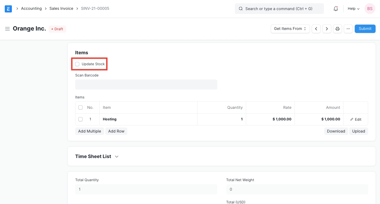 On checking Update Stock, Sales Invoice Item will show relevant fields like Warehouse, Serial No., Batch No., Item valuation etc.