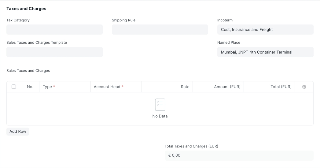 The "Incoterm" field is a link field that allows you to select the applicable Incoterm from a list of standardized trade terms.