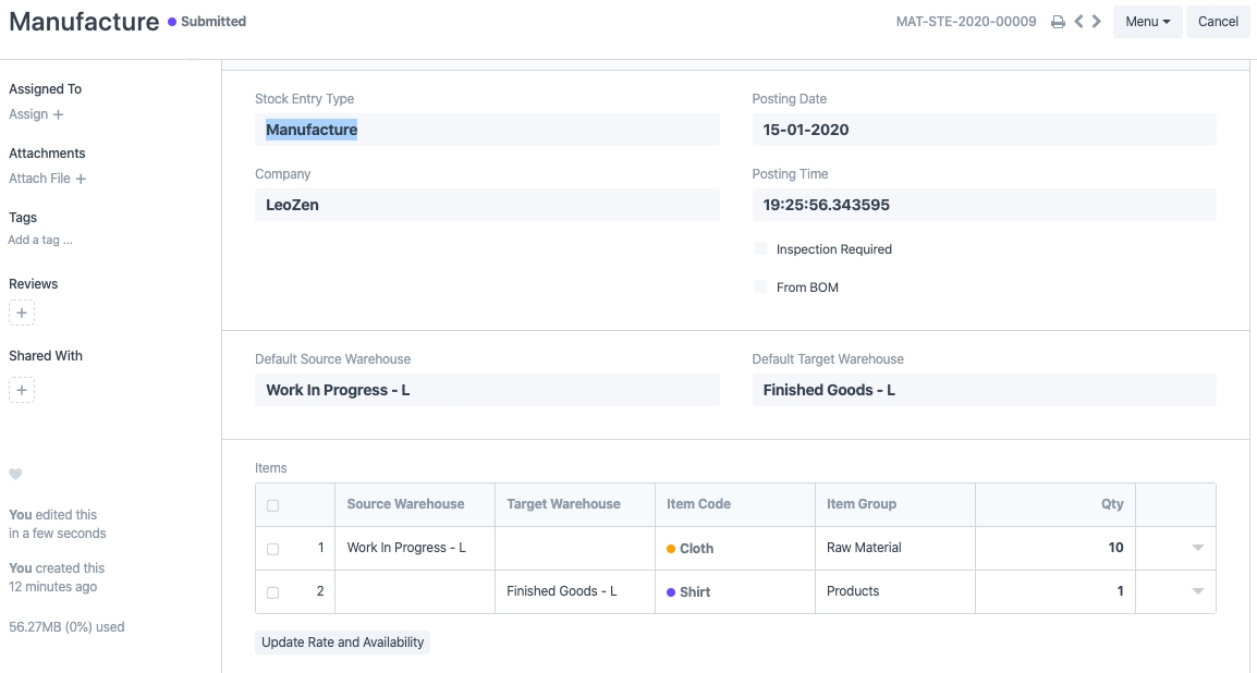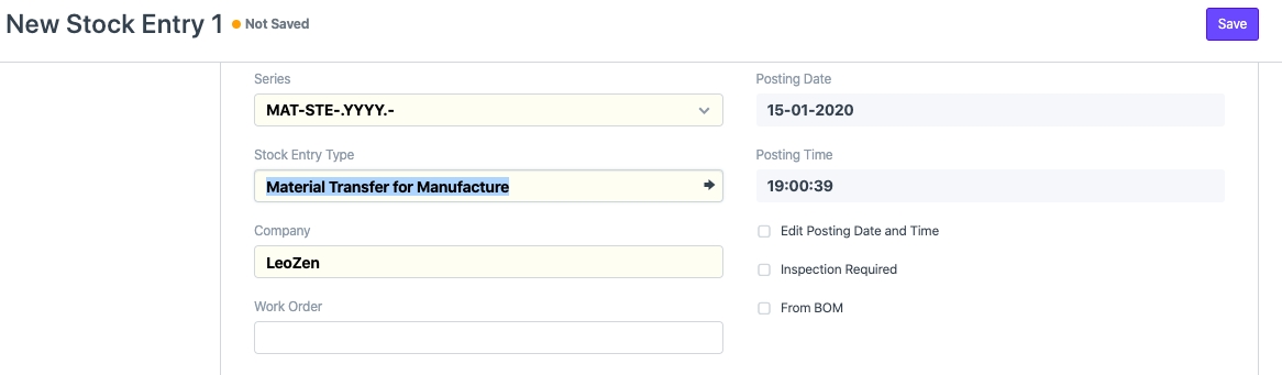 However, if you wish to perform it manually, the workaround is to create Stock Entries:1) Create a Stock Entry with Purpose as Material Transfer to Manufacture.