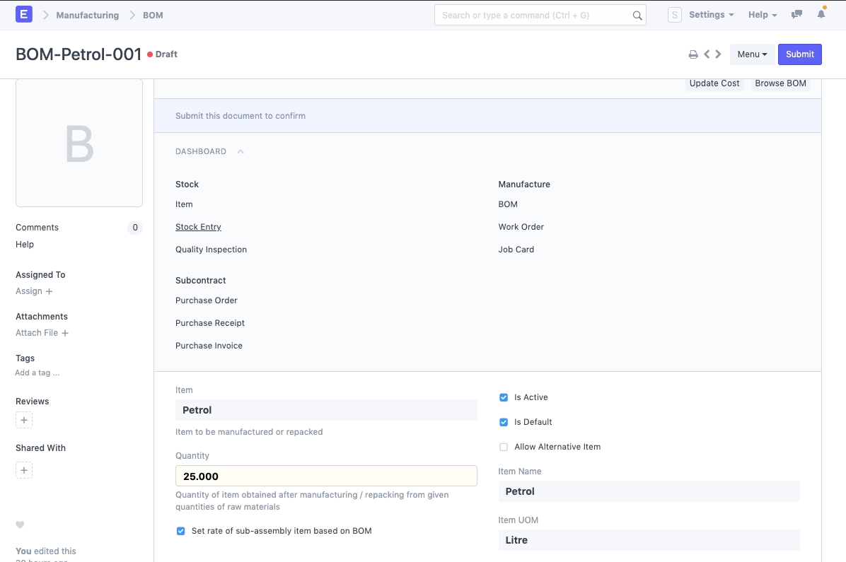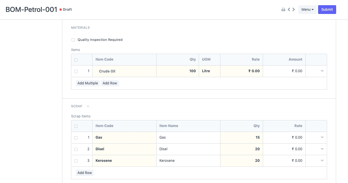 After creation of item master create a BOM for any of the FG you are going to produce from Crude oil (RM). Here I have created BOM of Petrol for 25 litres where I am going to use Crude oil (RM) of qty. 100 litres. Rest of the FG like Gas, Diesel & Kerosene I have added in Scrap section.