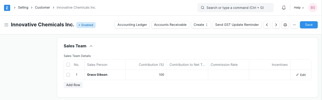 If more than one sales persons are working together on an order, then contribution (%) should be set for each Sales Person.
