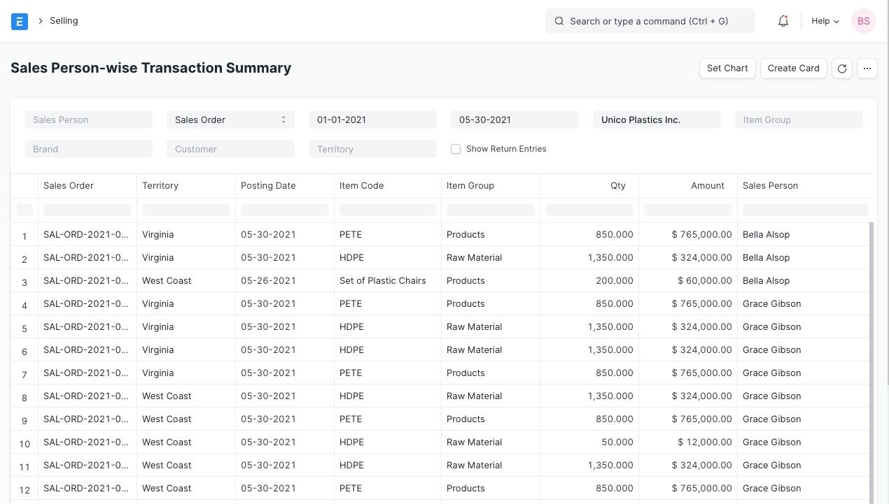Selling > Standard Reports > Sales Person-wise Transaction Summary