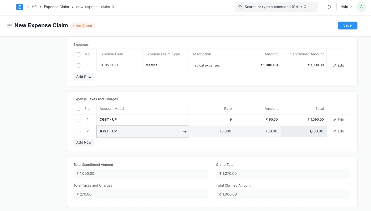 Set the Employee ID, date, the list of expenses, and corresponding taxes that are to be claimed and “Submit” the record.