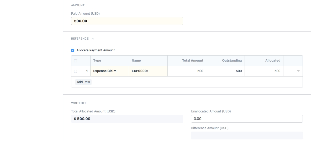 Alternatively, a Payment Entry can be made for an employee and all outstanding Expense Claims will be pulled in.