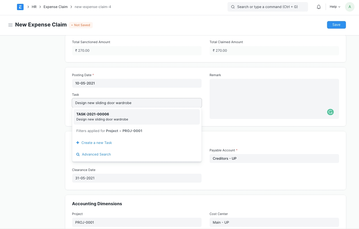To Link Expense Claim with Task or Project specify the Task or the Project while making an Expense Claim