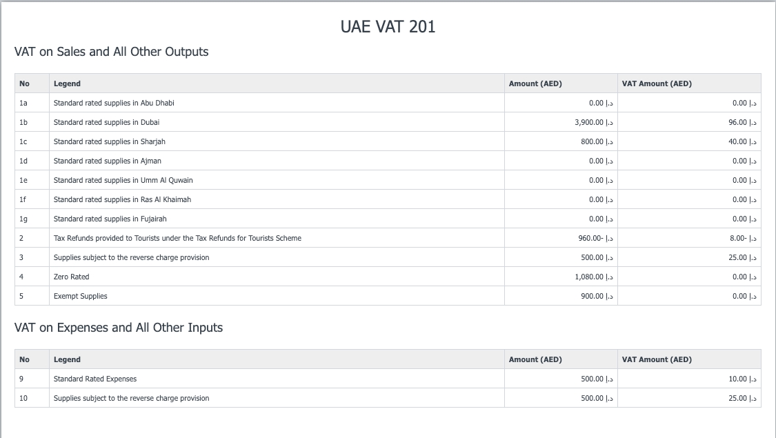 To generate UAE VAT 201 Report in Howinibs go to: > Accounting > Value-Added Tax (VAT UAE) > UAE VAT 201 or simply search for UAE VAT 201 in the awesomebar.