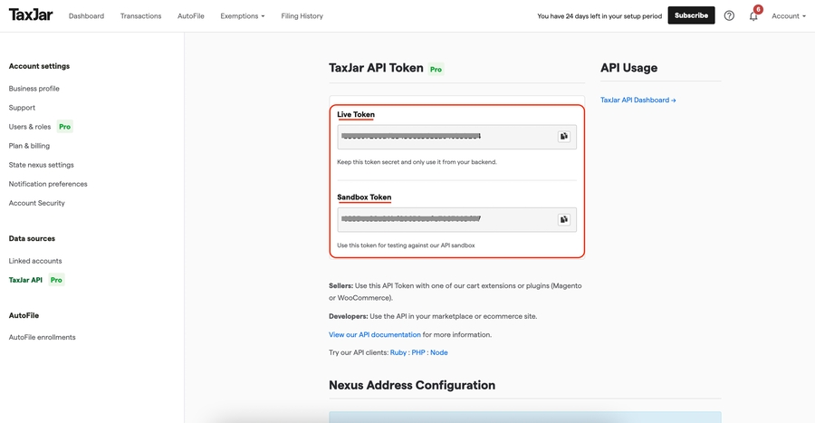 Copy the API tokens from your TaxJar account as directed above and paste it in the Live API Key and Sandbox API key field.