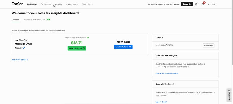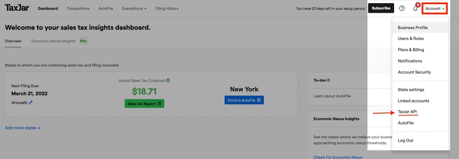 Login to your account dashboard and click on the Account button and click on TaxJar API in the dropdown list of options.